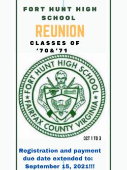 This special group rate is available for Friday, October 1, 2021 and ending with check-out on Monday, October 4, 2021. The last day you can book rooms at this special rate is September 1, 2021. If you have trouble with the link, please contact the hotel directly at 703-253-8600. (If you call, make sure you mention you are part of the Fort Hunt High School Alumni Association Class of ’70 & ’71.)